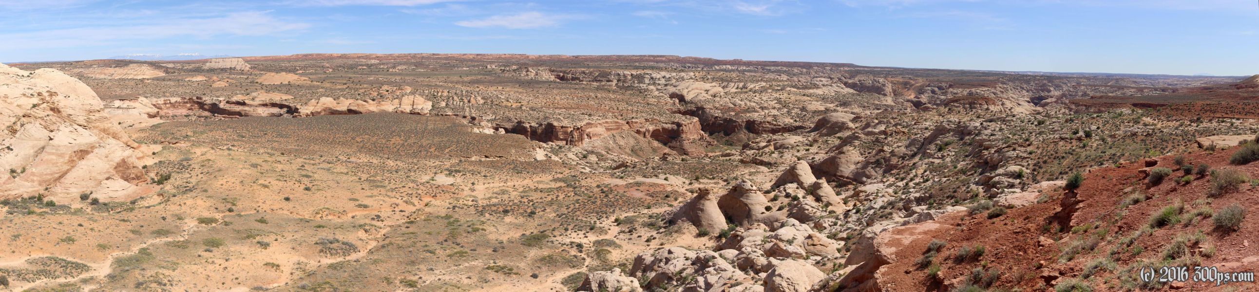The same pickup that asked me how I was doing yesterday passes me again today in the opposite direction. They stop and ask if I need water, nice of them, but I'm all filled up. At the turn for Horseshoe Canyon I decide to go up and take a look. This smaller road is even sandier than the main one, plus it climbs quite a bit, so it's a chore to get up over the ridge to see the canyon. I pull into a parking lot area where there are a fair number of vehicles. It appears people are camping and there is an outhouse. I end up talking to a group who has come to hike the canyon. One of the guys hitchhiked and bused his way down the Panamericana to Chile 50 years ago. He stayed in Santiago for a year teaching then another year in Brazil doing the same.