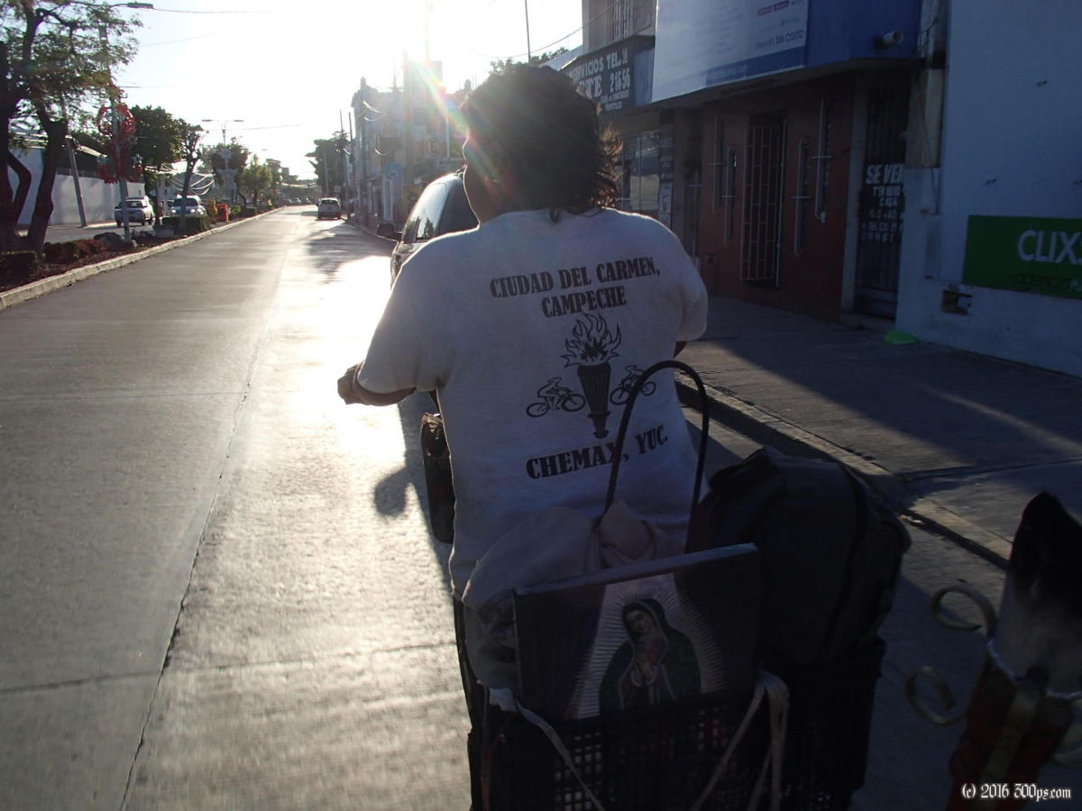 This guy has the start and finish for his promesa printed on his shirt: from Ciudad del Carmen to Chemax
