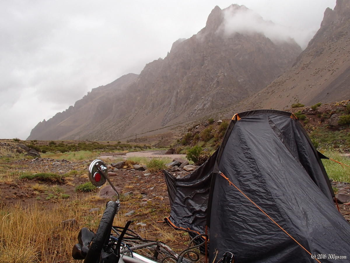 Campsite. One of the back stakes pulled up during the night, causing a pool of water to form inside the tent on that side.