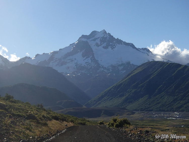 The top has impressive views of the Sierra Velluda. The descent into Chile has the same loose sand and gravel ripio. It was pretty dangerous because the tires would just start sliding out from under me at seemingly random points. I took it slow but fell once anyways. The front tire just slid out on me and I went tumbling. I got up wanting to kick the bike but took a picture instead. The headwinds didn't let up at all. After the initial descent the road crosses a long valley before descending again down to the Chilean border post. They looked bored shitless as well. There was some initial consternation that the Argentines hadn't given me a copy of the immigration form but they looked it up on the computer and said it was ok. The customs guy asked me a bunch of questions about what I was carrying but didn't search anything.