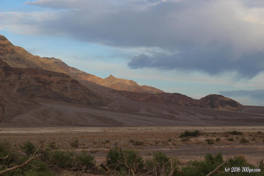 The road gets really narrow towards the end, with the walls of the canyon shooting straight up on either side almost like a slot canyon. A nice ride. Then the canyon spits me right out into Death Valley in dramatic fashion. I can see rain off in the distance on the western side of the valley. I hit pavement a couple of miles later, it's late and I don't see anywhere to camp. I could go north into the wind towards Scotty's Castle but surely that will take forever. I opt to go south towards some scrub trees that I can see from here. 3 miles later I roll the bike off the road to the dunes. A half mile of bouncing and I'm there to set up camp on the leeward side of a big dune.