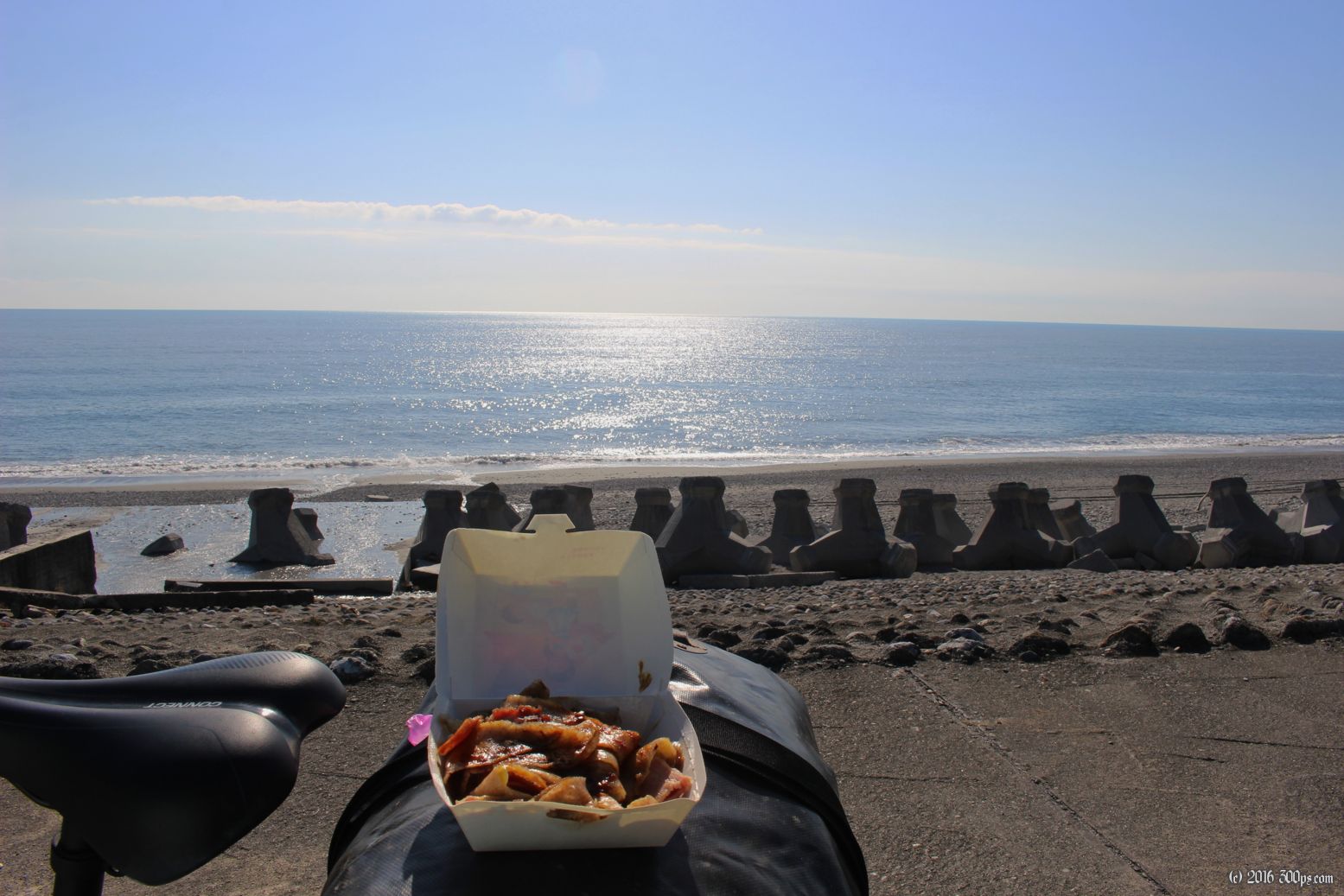 (fried egg and bacon in a tortilla-like thing) at the beach.