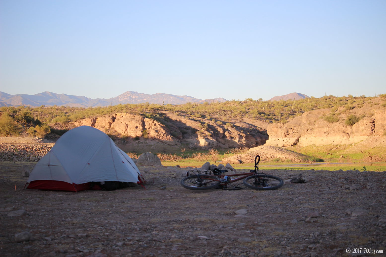 My campsite on an embankment overlooking the lake.