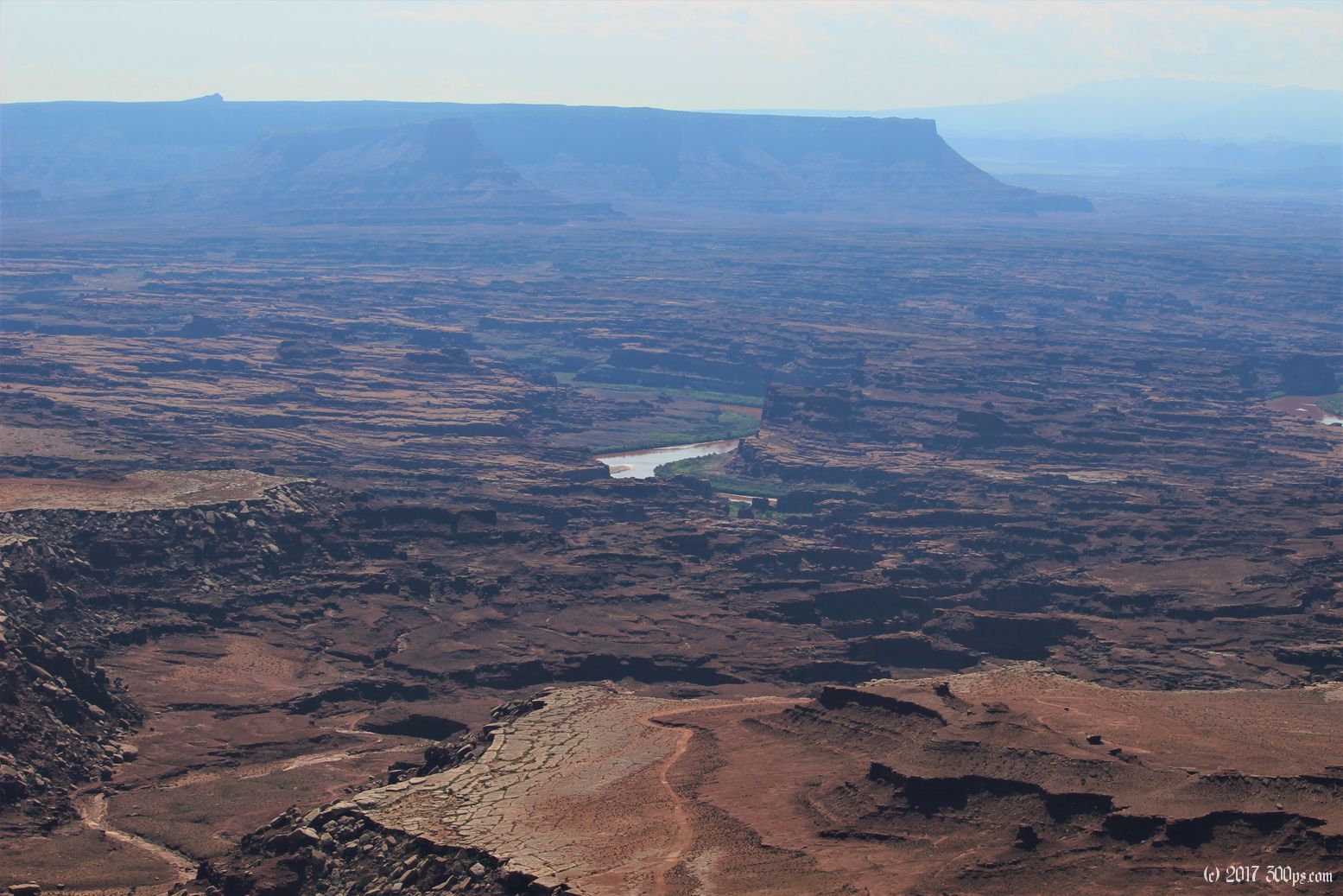 The Colorado River in the distance, at the bottom of multiple levels of canyons.